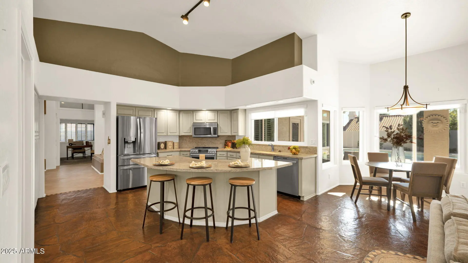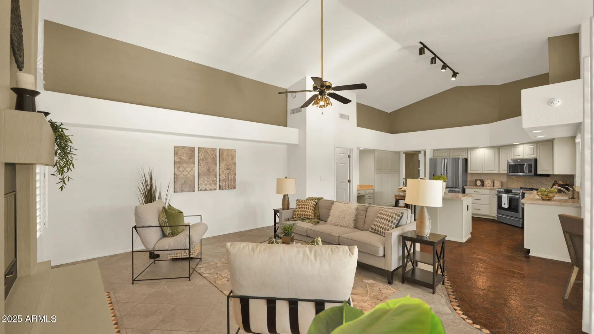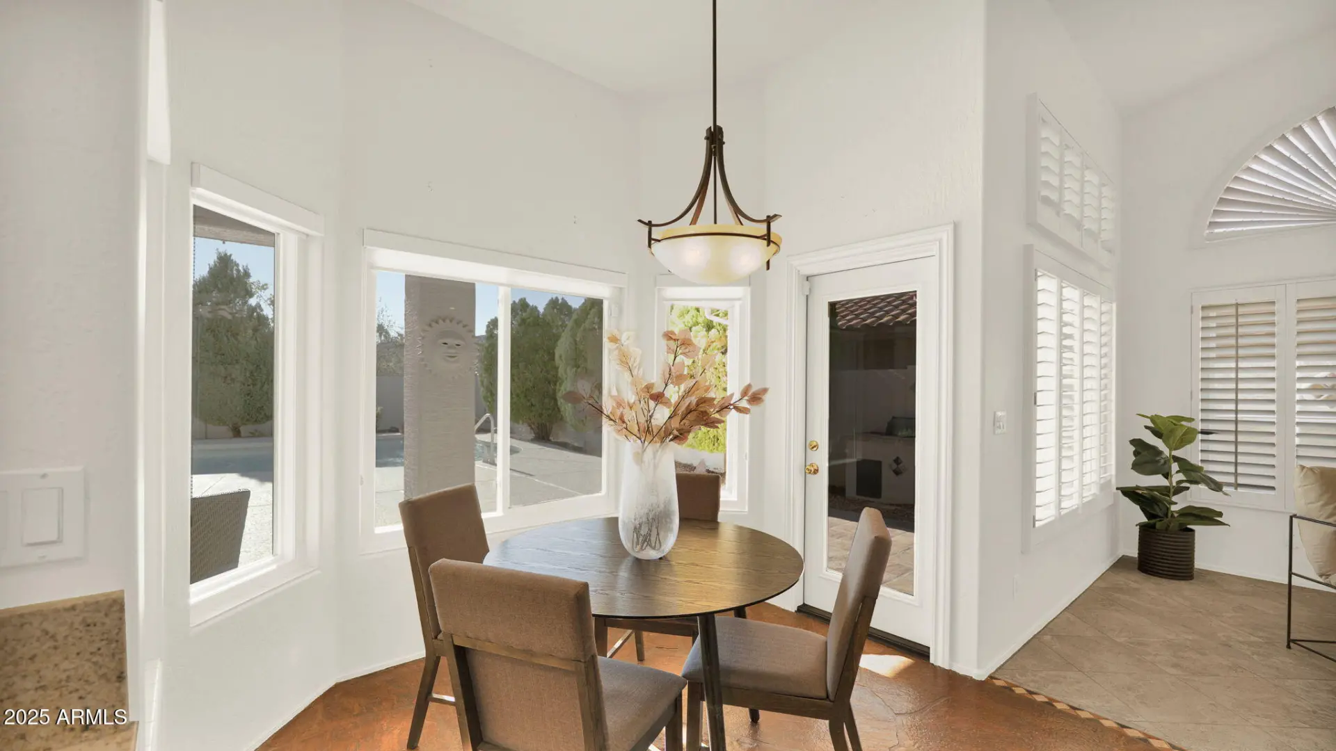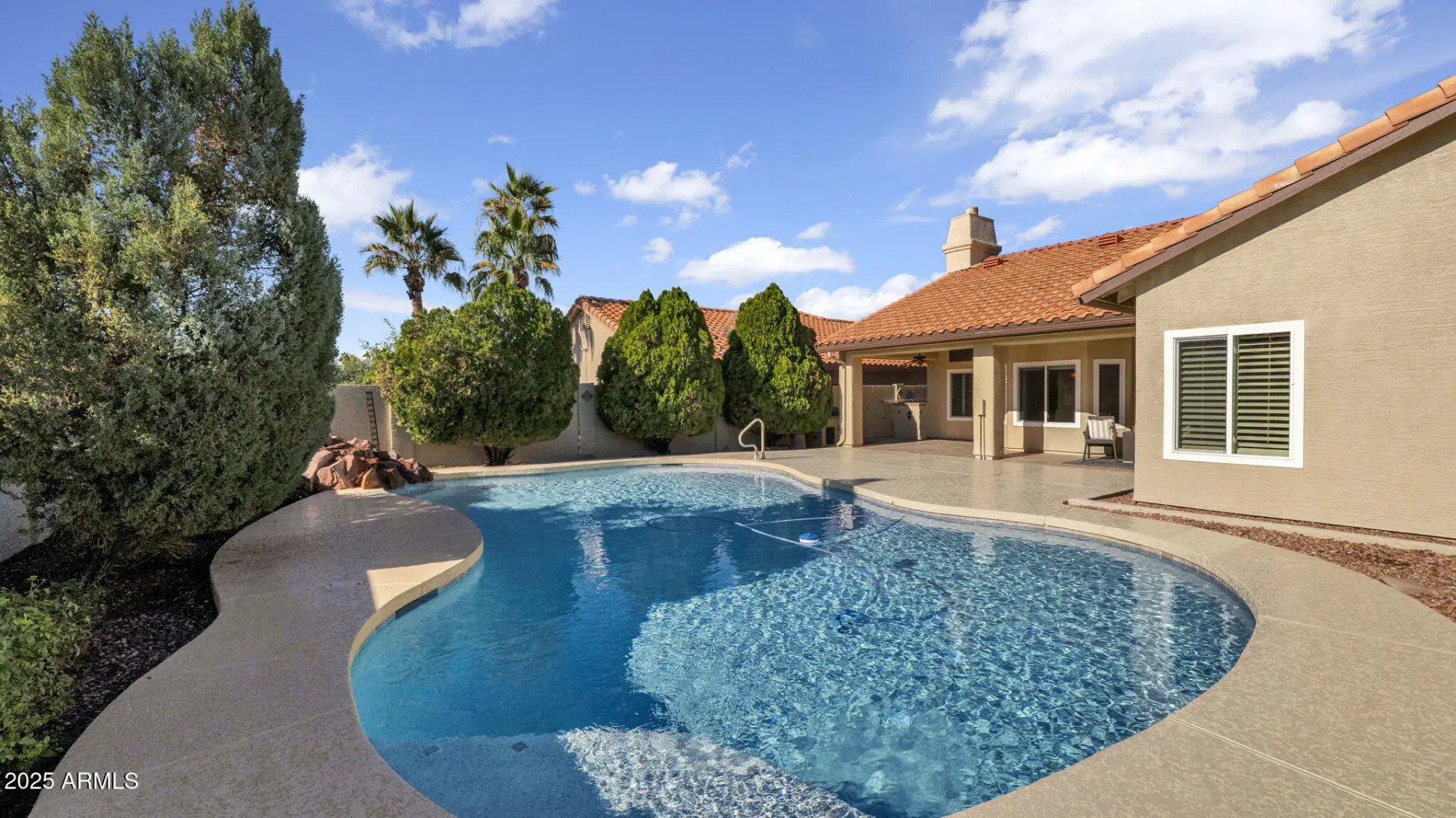 Welcome home to your Ahwatukee retreat—where major system upgrades, thoughtful care, and relaxed desert living come together beautifully. This single-level home offers a bright, open layout with vaulted ceilings and generous natural light flowing through the great room, kitchen, and family areas. The kitchen is designed for easy everyday living with granite counters, updated lighting, and stainless steel appliances—including a French door refrigerator with deli drawer and glass-top range. A breakfast bar opens directly to the family room, and both spaces enjoy beautiful views of the pool and backyard. All bedrooms are arranged along the same hallway for a comfortable, cohesive flow. The primary suite has an expanded design created in place of a fourth bedroom for a private sitting