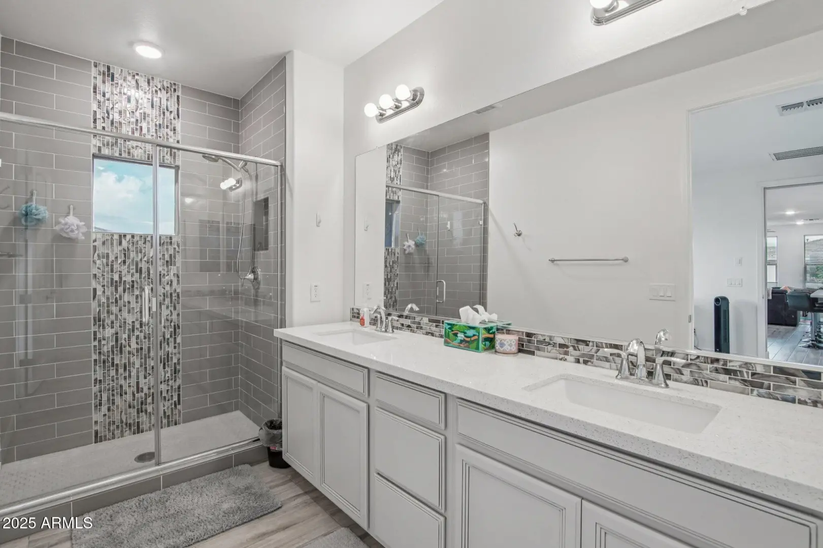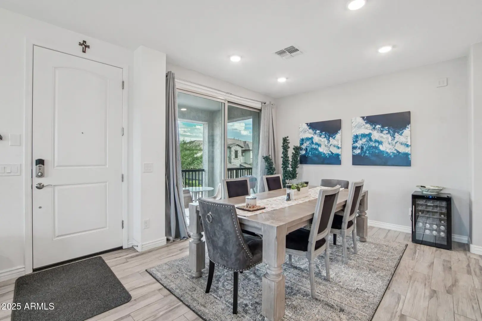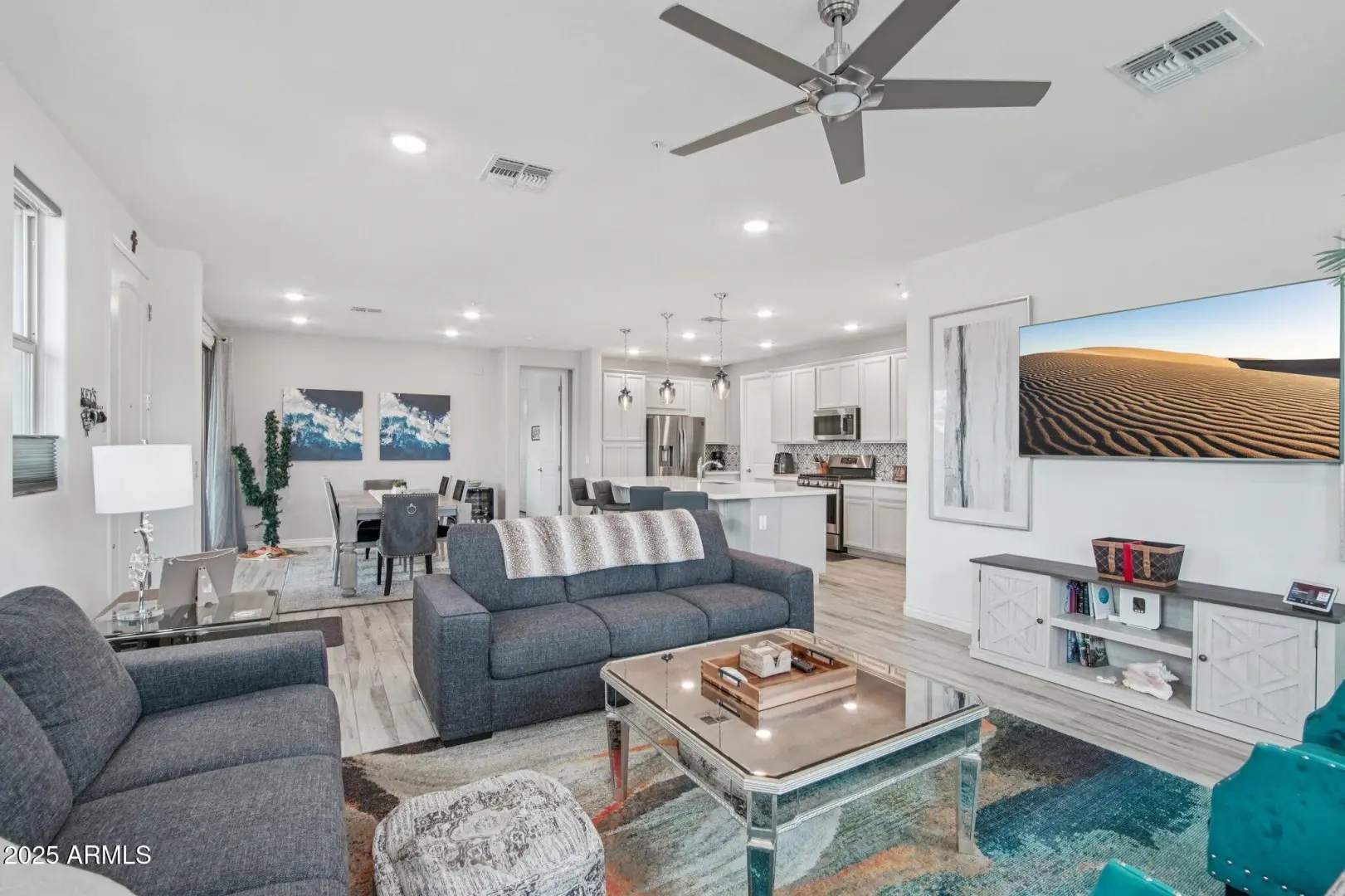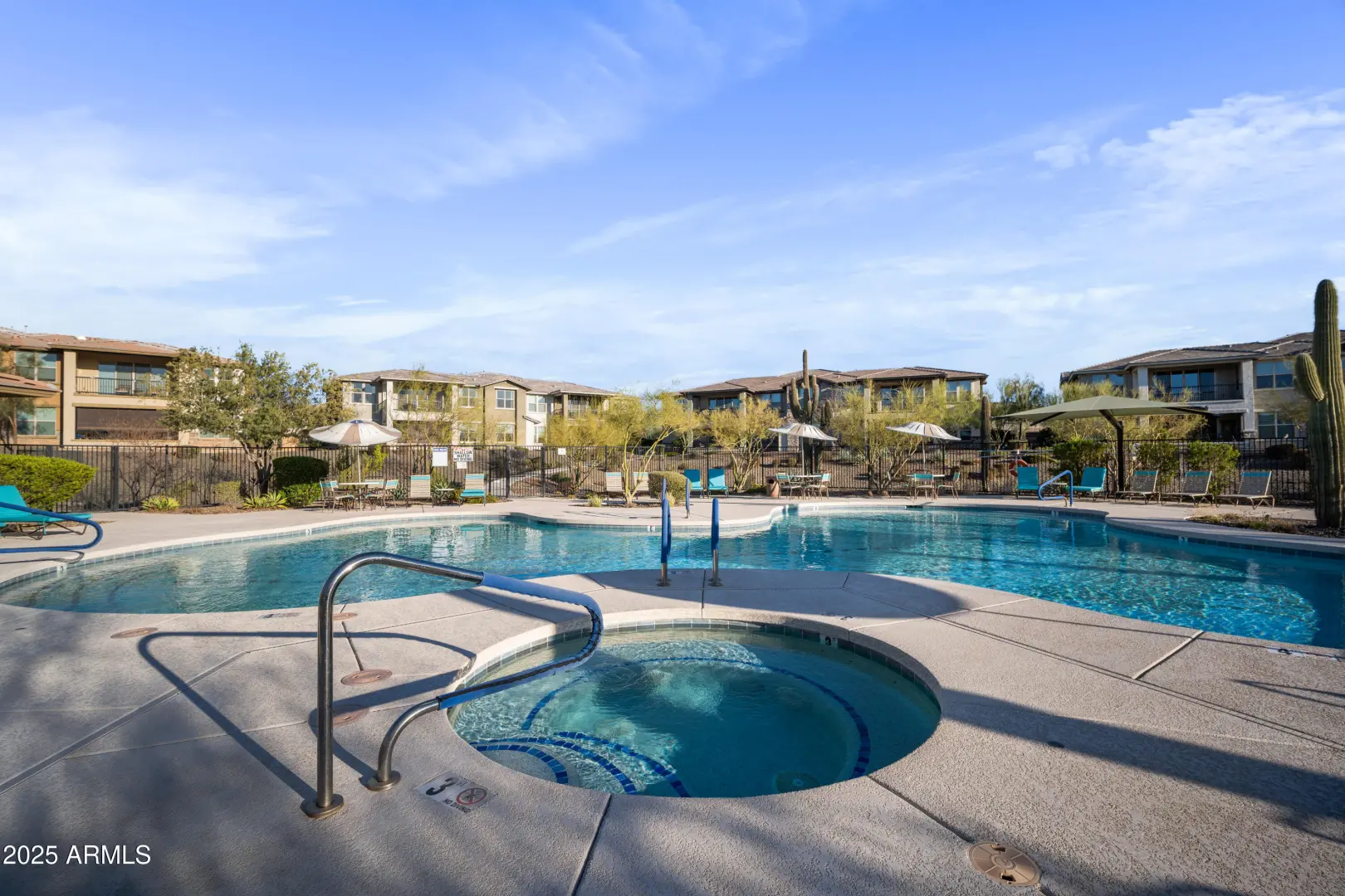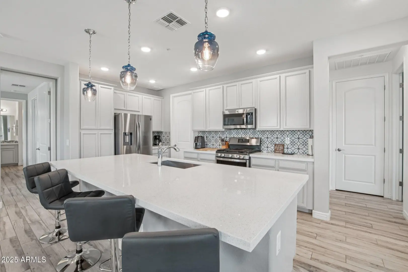 Beautifully upgraded, FULLY FURNISHED condo in the gated community of Rancho North! Ready for you to move right in! This open, spacious, split floor plan features a stunning kitchen with quartz countertops, tile backsplash, gas cooktop, upgraded pendant lights, and a large island perfect for entertaining. The primary suite offers a walk-in closet, dual sinks, upgraded tile shower, and sliding door to the balcony. The second bath also features quartz countertops. There is also a full house water softener and a private one car garage! Enjoy elegant desert living with community pool, spa, and fitness center nearby!